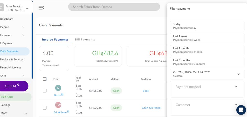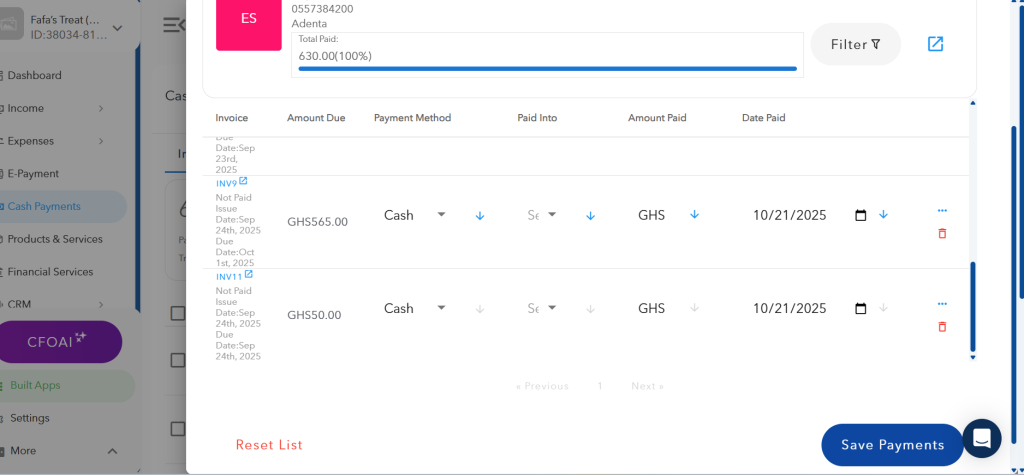 2. Access Cash Payments – Select “Cash Payments” from the main navigation menu to see all recorded customer collections.