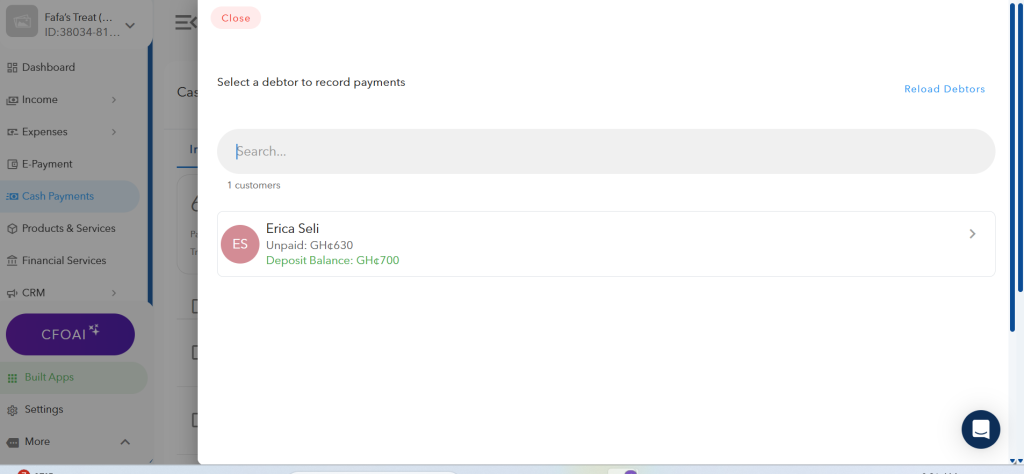 3. Record Payments – Click the “Record Payments” button to open a side panel with a list of customers who owe you.