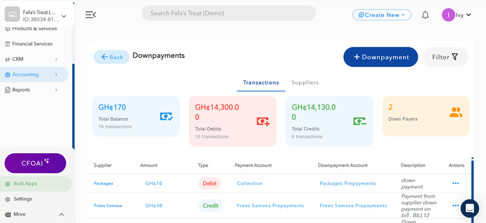 Create Down Payments: Easily initiate down payments by selecting a supplier and completing the required details in a user-friendly form.